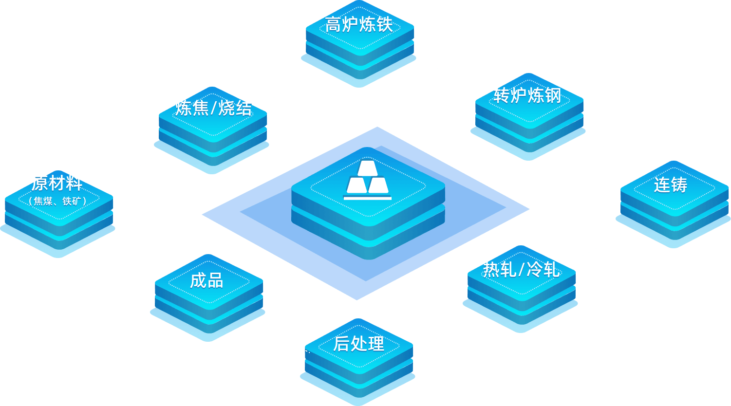经高炉用铁矿石等原料炼出生铁,再通过转炉等将生铁炼成钢水并精炼,最后经连铸成钢坯、轧制得到各类钢材。