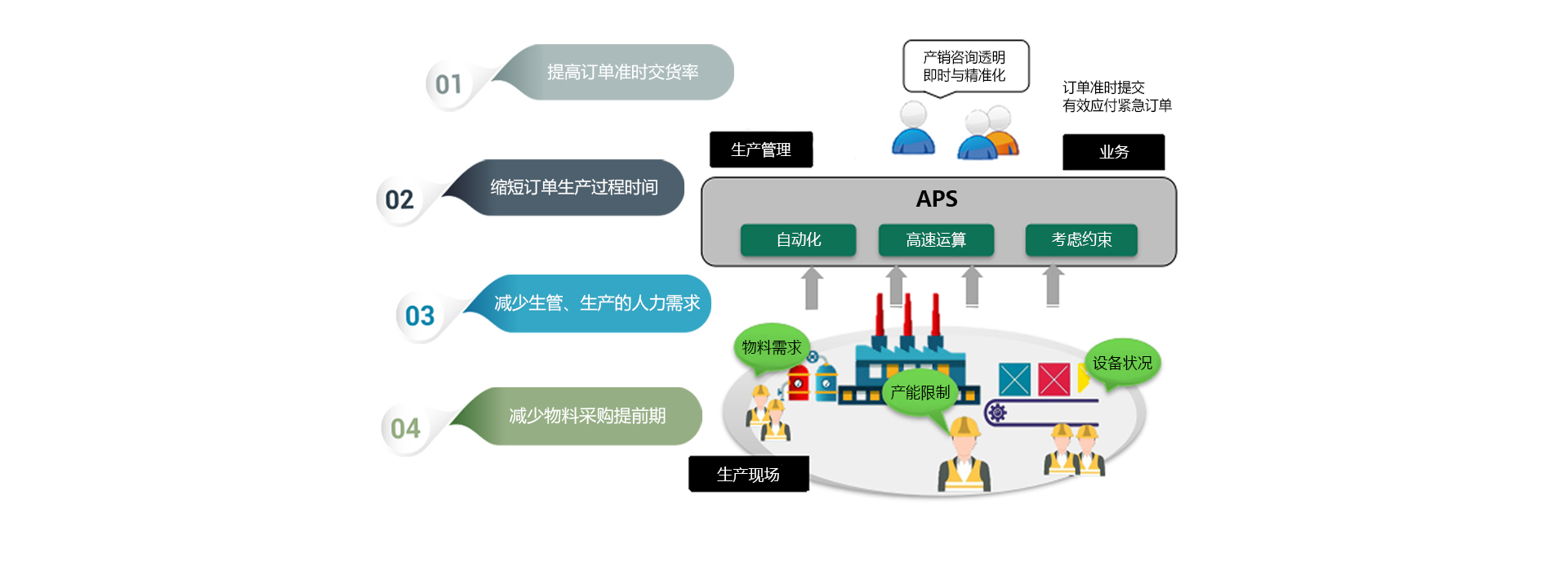 APS高级计划排程主要解决“在有限产能条件下,交期产能精确预测、工序生产与物料供应最优详细计划”的问题。APS高级计划排程(高级计划排产)系统制定合理优 化的详细生产计划,并且还可以将实绩与计划结合,接收MES制造执行系统或者其他工序完工反馈信息,从而彻底解决工序生产计划与物料需求计划难做的问题。APS高级计划排程(高级计划排产)系统是企业实施JIT精益制造系统的最有效工具。