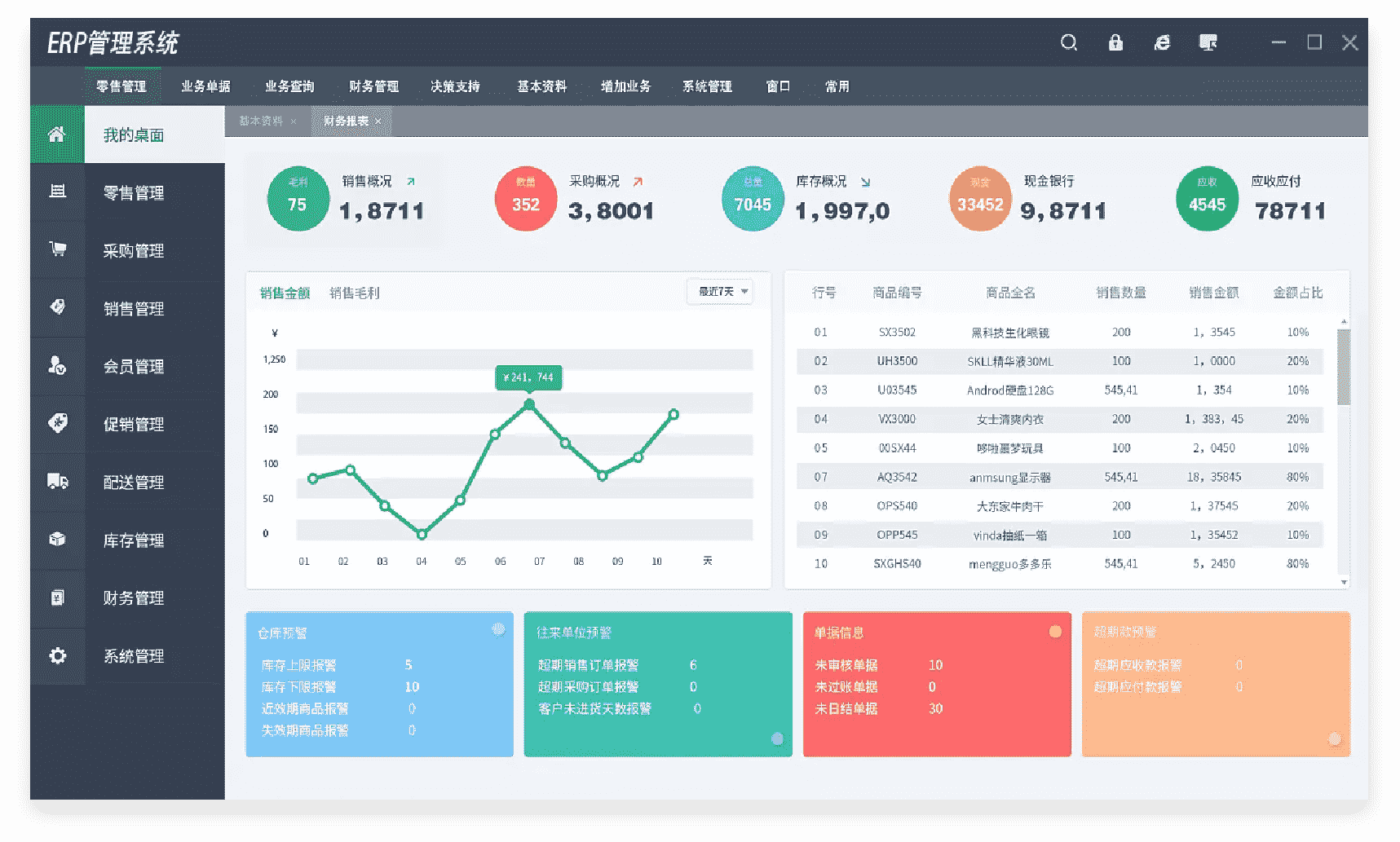 包括客户采购、入库、出库、盘点、调拨、接货、换货、退货、发货、订单、回款、付款、售后、备忘录、统计分析等功能